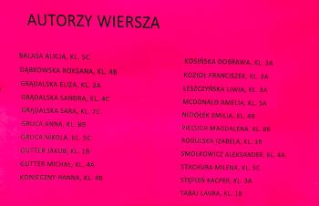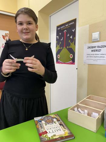 Galerie zdjęć Wyniki konkursu plastyki obrzędowej na Pisankę Wielkanocną 2.04.2026 Rozstrzygnięcie konkursu plastycznego promującego czytelnictwo pt. „Dom bajek dla dzieci” 2.04.2026 Wielkanocna zabawa czytelnicza w bibliotece szkolnej 2.04.2026 Wojewódzkie Igrzyska Dzieci w Pływaniu Indywidualnym 1.04.2026 Marzec w świetlicy 1.04.2026 Wizyta Wolontariuszy w Domu Pomocy Społecznej 1.04.2026 Warsztaty wiosenno-wielkanocne 31.03.2026 Konkurs recytatorski 30.03.2026 Międzynarodowy Dzień Teatru w świetlicy 30.03.2026 Dzień Poezji w szkolnej bibliotece — słowa, które łączą 27.03.2026 Pieczątki w słoiku — rozstrzygnięcie zabawy bibliotecznej 27.03.2026 Czytelnicze dodatki od Wydawnictwa Literatura 27.03.2026 „Bilet do biblioteki” — podsumowanie akcji czytelniczej 26.03.2026 Konkurs legend – rozstrzygnięty! 12.03.2026 Kampania „No Promil – No Problem” w naszej szkole 11.03.2026 Luty w świetlicy 2.03.2026 Koszykówka – zdobywamy ,,ZŁOTO” na zawodach rejonowych IMS 27.02.2026 Konkurs „List do Sąsiada” 26.02.2026 Działania styczeń - świetlica 3.02.2026 Wieczór filmowy 2.02.2026