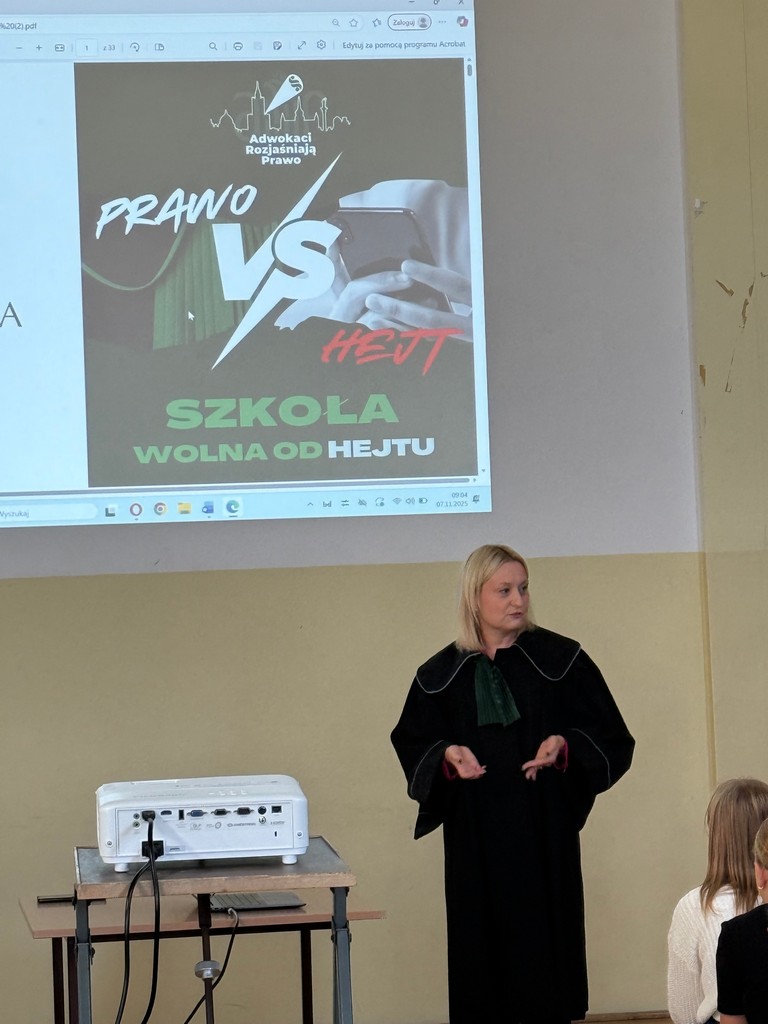 W piątek 7 listopada, uczniowie klas IV - VIII wzięli udział w akcji edukacyjnej Adwokaci rozjaśniają prawo. Tematem przewodnim spotkania było hasło: „Prawo vs. Hejt. Szkoła wolna od hejtu”.