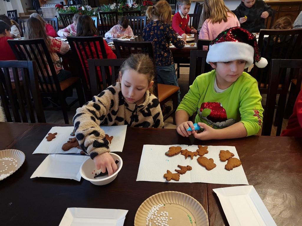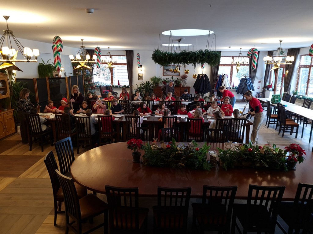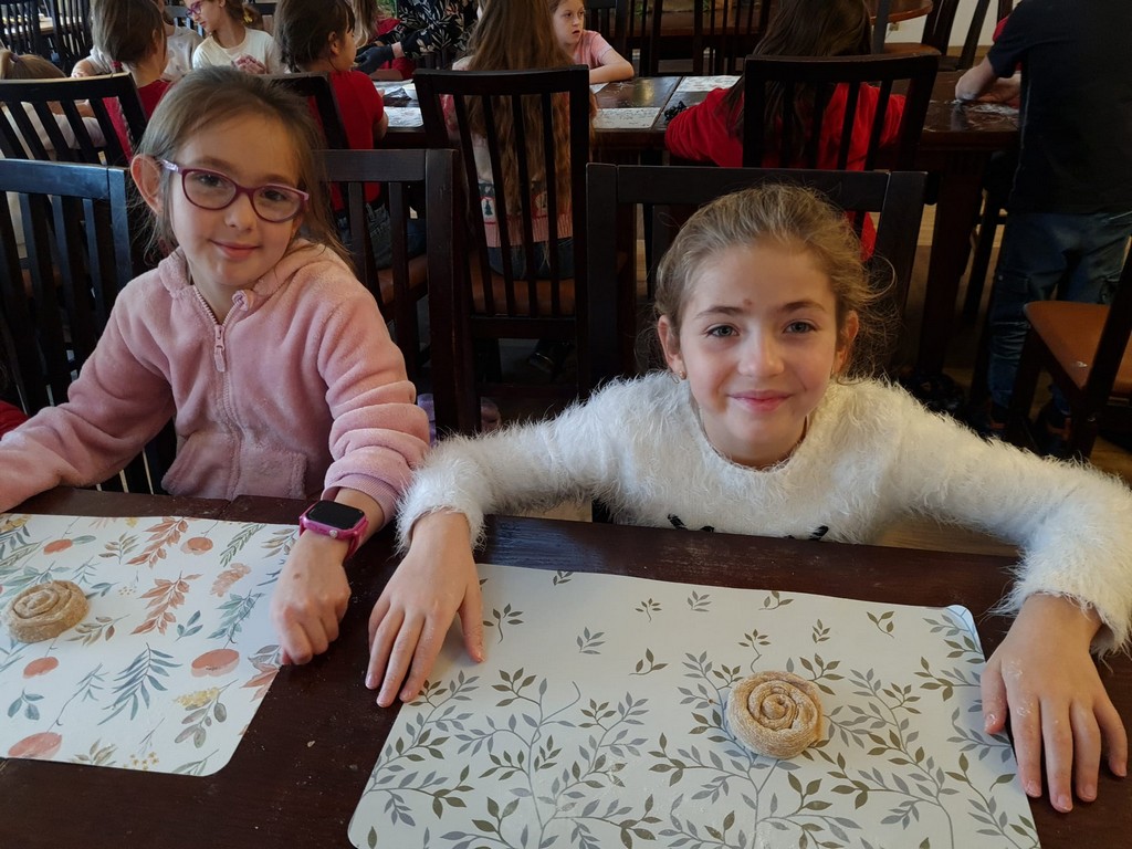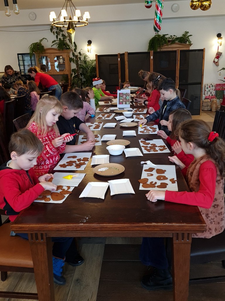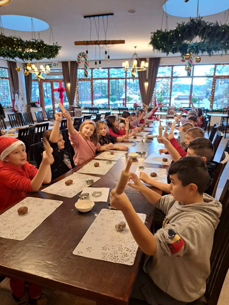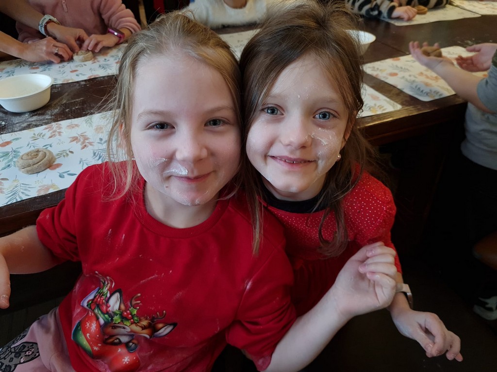 Następnie uczestnicy wycieczki udali się do restauracji na zajęcia kulinarne, gdzie rozpoczęli od wypiekania i ozdabiania świątecznych pierniczków. Kreatywność dzieci nie miała granic – kolorowe lukry, posypki i świąteczne kształty sprawiły, że stoły zapełniły się pięknie udekorowanymi arcydziełami. Kolejnym etapem warsztatów było przygotowywanie cynamonowych bułeczek drożdżowych, które wypełniły ośrodek ciepłym, korzennym aromatem.