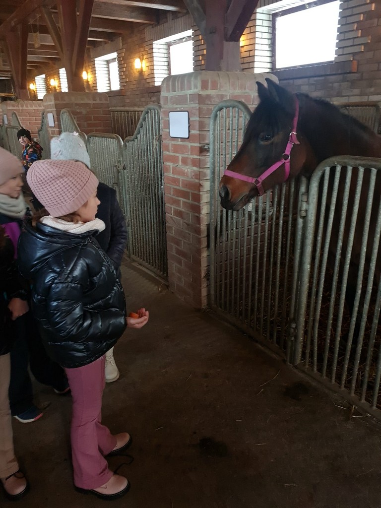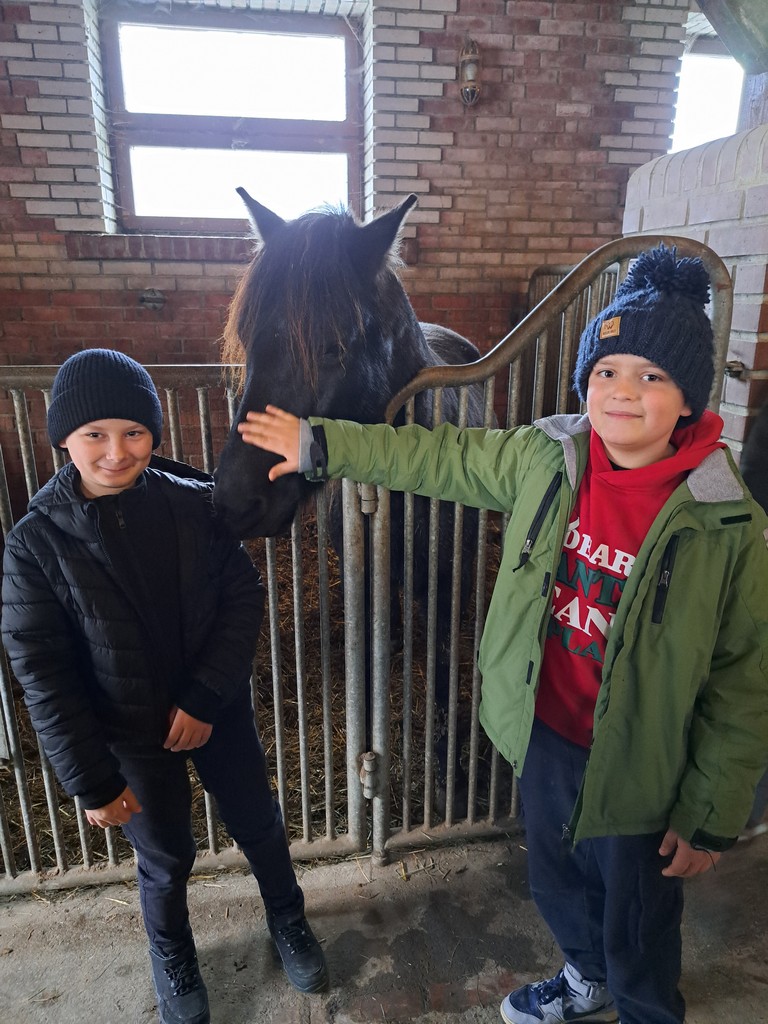Pierwszym punktem programu było zwiedzanie stadniny koni. Wychowankowie poznali najważniejsze informacje dotyczące pielęgnacji i zwyczajów tych dostojnych zwierząt. Z ogromnym zainteresowaniem oglądali stajnie oraz konie, które chętnie podchodziły po marchewkowe smakołyki przygotowane specjalnie dla nich.