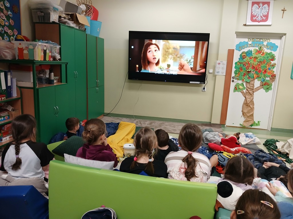 W piątek tuż przed feriami w świetlicy szkolnej odbył się wyjątkowy wieczór filmowy. Wydarzenie miało na celu integrację grupy oraz wspólne przeżywanie emocji jakie daje kino. Dzieci przybyły na spotkanie przynosząc ze sobą koce, poduszki, pluszaki oraz ulubione przekąski, wszystko to zachęcało do komfortowego oglądania.