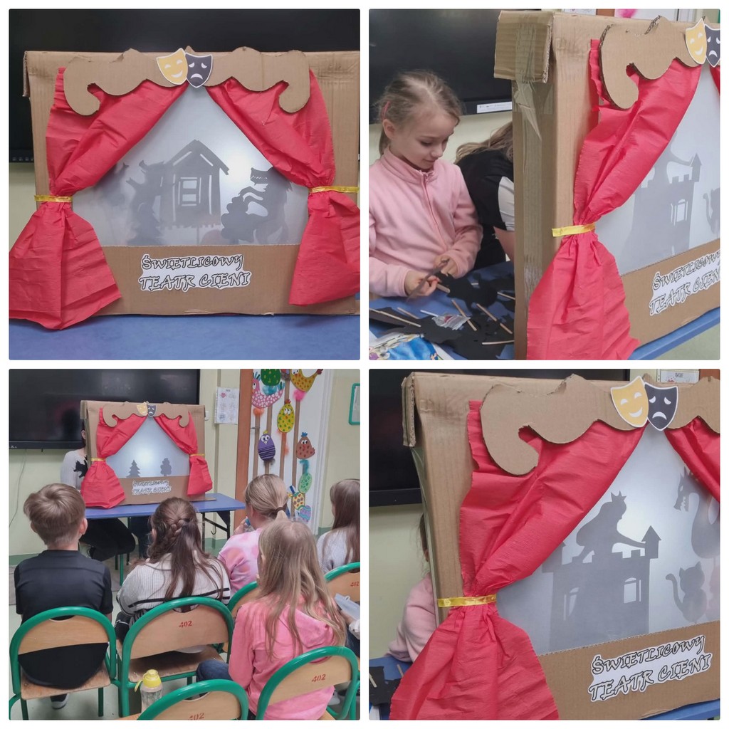 W trakcie spotkania omówiliśmy także różne rodzaje teatru, takie jak teatr lalek, teatr pantomimy oraz teatr cieni. To właśnie teatr cieni wzbudził największe zainteresowanie – dzieci z ciekawością obserwowały, jak za pomocą światła i prostych form można tworzyć postacie i całe scenki.