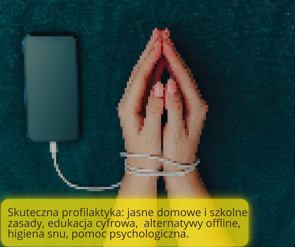 Polska literatura i raporty pokazują, że skuteczna profilaktyka łączy: jasne domowe i szkolne zasady, edukację cyfrową, alternatywy offline, higienę snu i – w razie potrzeby – profesjonalną pomoc psychologiczną (KCPU, 2024; Lange [red.] i in., 2023; Wojtczak i wsp., 2024; Bielawska i in., 2023).